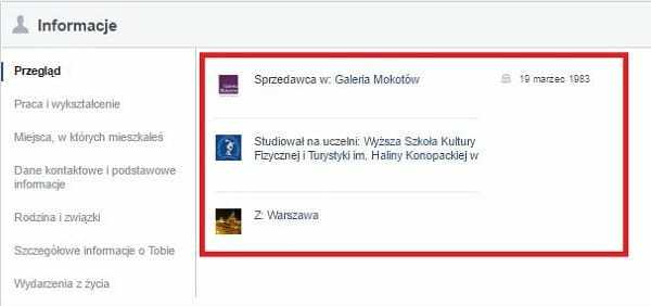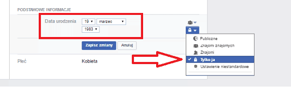 Nie należy umieszczać swojej daty urodzenia lub członków rodziny. Takie informacje mogą narazić Cię na ogromne straty finansowe. Tak samo nie należy udostępniać numerów telefonów. Jeśli koniecznie musisz podać swoje dane to niech to będzie najlepiej tylko imię i data urodzenia – lecz bez podawania roku urodzenia. Możesz też zablokować wyświetlenie daty urodzenia tak jak to zostało pokazane na obrazku poniżej.