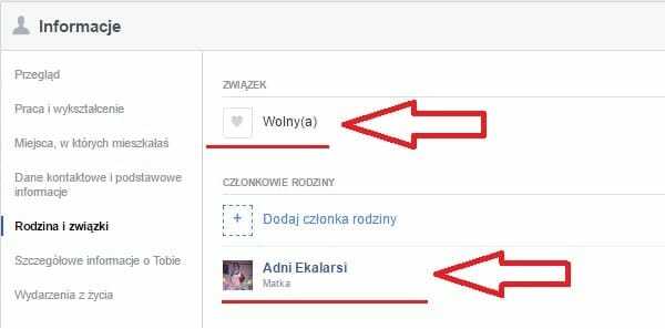 Jeśli jesteś singlem nie warto tego dawać do publicznej wiadomości. Dlaczego? Wielu naciągaczy tylko czeka na to, aby Cię „uszczęśliwić” żebyś nie była samotna. Wykorzystując swoje umiejętności manipulacyjne potrafią wpędzić wiele samotnych kobiet w ogromne kłopoty finansowe i wyczyścić ich konta bankowe. Najlepiej w tym miejscu na profilu nic nie wypełniać. To samo powinno również dotyczyć oznaczania członków rodziny i relacji między wami. Przestępca może wykorzystać te dane i próbować się powołać na członka twojej rodziny, że jest w kłopotach i będzie próbował wyłudzić pieniądze. Taki motyw jest bardzo popularny wśród policji – wystarczy tylko przypomnieć jak często przestępcy wykorzystują babcie metodą na wnuczka. Pisząc koligacje rodzinne też możemy być narażeni na tego typu przestępstwa.