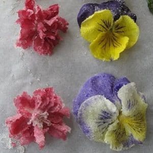 Na specjalne okazje możesz udekorować tort czy ciasto kandyzowanymi kwiatami. Świeże kwiaty np. róży, bratków, nasturcji, fiołków czy stokrotek posmaruj lub wymocz w roztrzepanym białku, połóż na blasze pokrytej pergaminem i posyp cukrem pudrem. Teraz kwiaty powinny się suszyć ok. 30 minut w ciepłym piekarniku przy uchylonych drzwiczkach.
