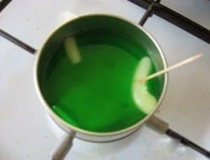 Kolejno koniec knota owiń wokół ołówka i opuść na dno szklanki, tak jak to jest ukazane na zdjęciu poniżej. Jeśli nie masz oryginalnego knota możesz użyć cienkiego sznurka (np. kuchennego). Po wykonaniu tej czynności rozpuść wosk ze świecy w rondelku i dodaj razem z wybranym kolorem świecowej kredki.
