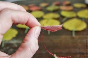 Zaczynamy od największych liści. Bierzemy kawałek drucika i przebijamy nim liść w odległości około 0,5 cm od szerszej krawędzi.