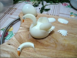 Czas na główne postacie naszej sceny – łabędzie. Z dwóch jajek utnij doły na szerszej krawędzi. Powstanie wtedy tułów łabędzia, który nie będzie się przewracał. Wycięte kawałki uformuj w kształcie ogona. Z pozostałych dwóch jaj wytnij szyję i skrzydła. Z marchewki wytnij dziób, do zrobienia oczu łabędzia wykorzystaj ziarenka mielonego pieprzu. Przy wycinaniu skrzydeł, ogona i szyi zachowaj szczególną ostrożność. Białko jest kruche i efekt naszej pracy może być utracony. Połącz wszystkie elementy. Skrzydła i ogon włóż w zrobione wcześniej nacięcia w jajku – tułowiu. Do połączenia szyi, dziobu i tułowiu użyj wykałaczek.