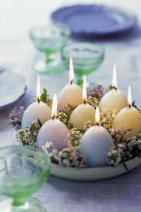 Egg-shaped candles on table